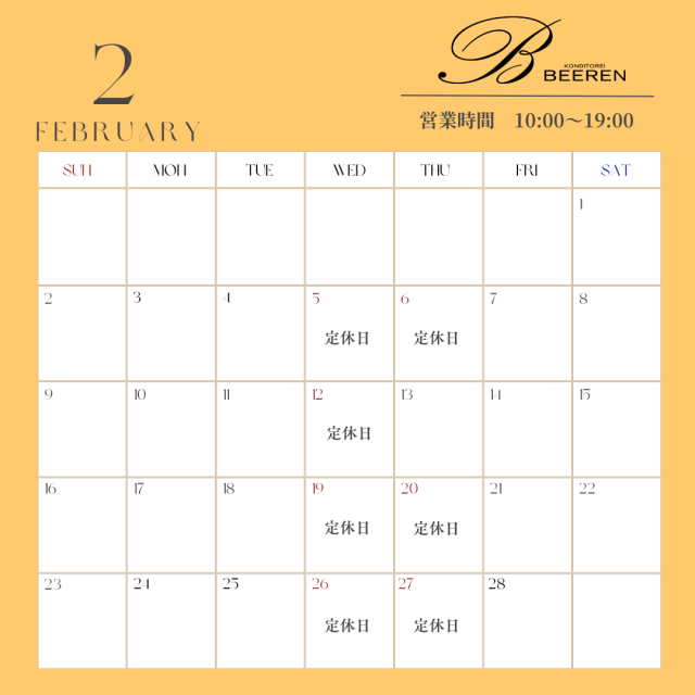 投稿日2025.02.01 ◇2025年2月カレンダー◇ この記事は、投稿から半年以上が経過しています。 料金やサービス内容など、現在のサービス内容と異なる場合がございます。 2025年2月定休日カレンダー 5.6日(水・木)定休日 12日(水)定休日 19・20日(水・木)定休日 26・27日(水・木)定休日 バレンタインの週は12日(水曜日)のみお休みをいただきます 皆さまのご来店を心よりお待ちしております(*^^*)