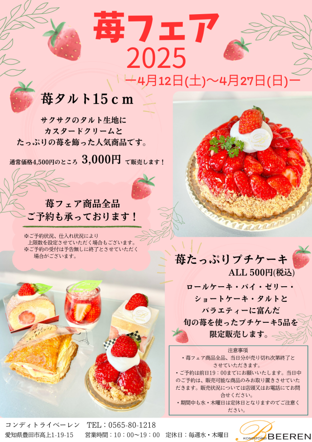 イベント 投稿日2025.04.04 ◇苺フェア2025◇ この記事は、投稿から半年以上が経過しています。 料金やサービス内容など、現在のサービス内容と異なる場合がございます。 苺フェア2025を開催いたします!!! 4月12日~27日までの期間(定休日を除く)、旬の苺を使ったケーキを多数ご用意しております♪ そして!人気の苺タルト15cmを通常価格4,500円のところ、3,000円で販売いたします!!! 店頭又はお電話にてご予約いただけます♪ ぜひこの機会に、旬の苺を使ったケーキを贅沢に味わってください(*^^*)