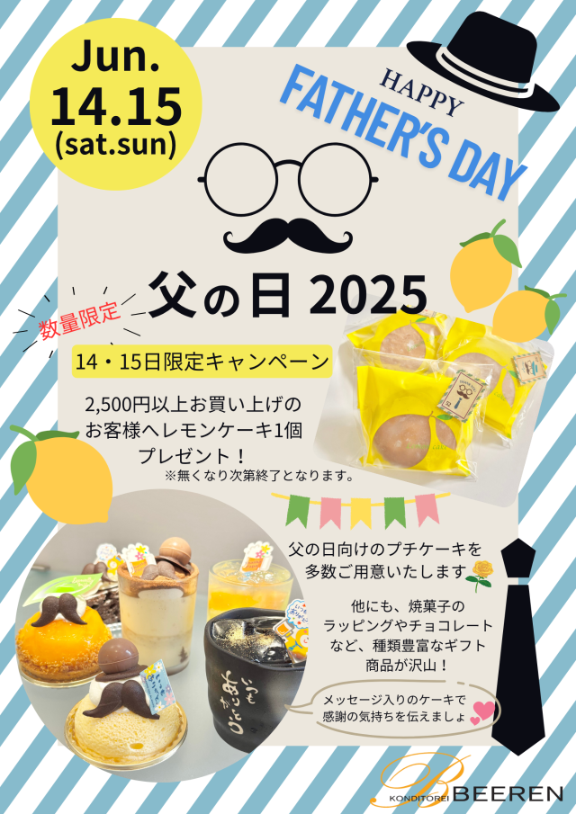 イベント 投稿日2025.06.09 ◇父の日2025◇ 6月14・15日の2日間、父の日向け商品を多数ご用意いたします!!! また、2,500円以上お買い上げのお客様へ フレッシュなレモン香る焼菓子「レモンケーキ」を1個プレゼント(^^♪ 両日とも50個限定で、無くなり次第終了となります。 メッセージ入りのケーキや可愛らしいラッピング・チョコレートなど お父さんへ感謝の気持ちとともにスイーツギフトはいかがでしょうか(*^^*) 皆さまのご来店を心よりお待ちしております♪
