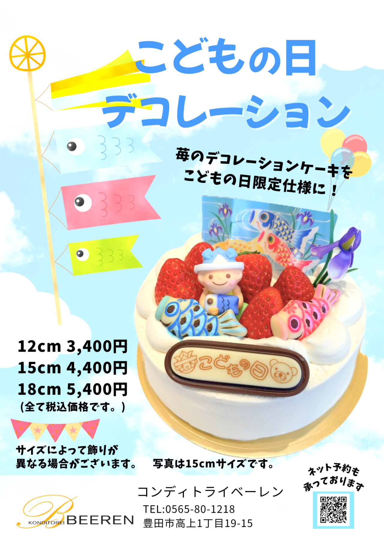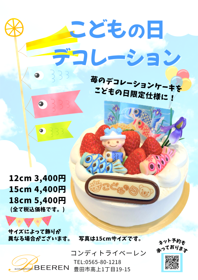 イベント 投稿日2026.04.28 ◇こどもの日◇ こどもの日デコレーション ご予約承り中です!!! 人気の苺デコレーションをこどもの日仕様にしました(*^^*) 18cm以上のサイズをご希望の方は店舗までお問い合わせください♪ お子様の健やかな成長を願って、ひとつひとつ丁寧にお作りいたします。