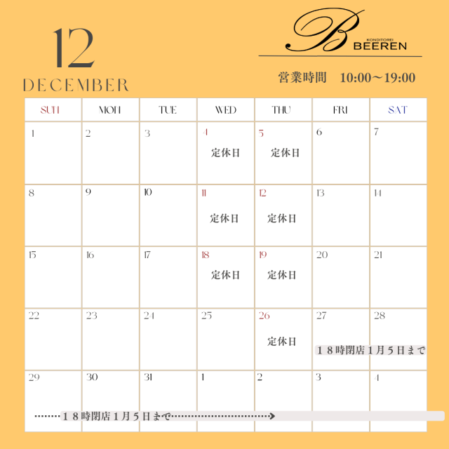 お知らせ 投稿日2024.12.04 ◇2024年12月カレンダー◇ この記事は、投稿から半年以上が経過しています。 料金やサービス内容など、現在のサービス内容と異なる場合がございます。 2024年12月定休日カレンダー 4・5日(水・木)定休日 11・12日(水・木)定休日 18・19日(水・木)定休日 26日(水)定休日 クリスマスケーキのご予約は12月19日(木)までです! 12月27日~1月5日まで18時閉店となります。 通常と異なる為、お気を付けてご来店くださいませ