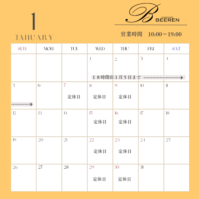 お知らせ 投稿日2024.12.20 ◇2025年1月カレンダー◇ この記事は、投稿から半年以上が経過しています。 料金やサービス内容など、現在のサービス内容と異なる場合がございます。 2025年1月定休日カレンダー 7・8・9日(火・水・木)定休日 15・16日(水・木)定休日 22・23日(水・木)定休日 29・30日(水・木)定休日 12月27日~1月5日まで18時閉店となります 通常と異なる為、お気を付けてご来店くださいませ