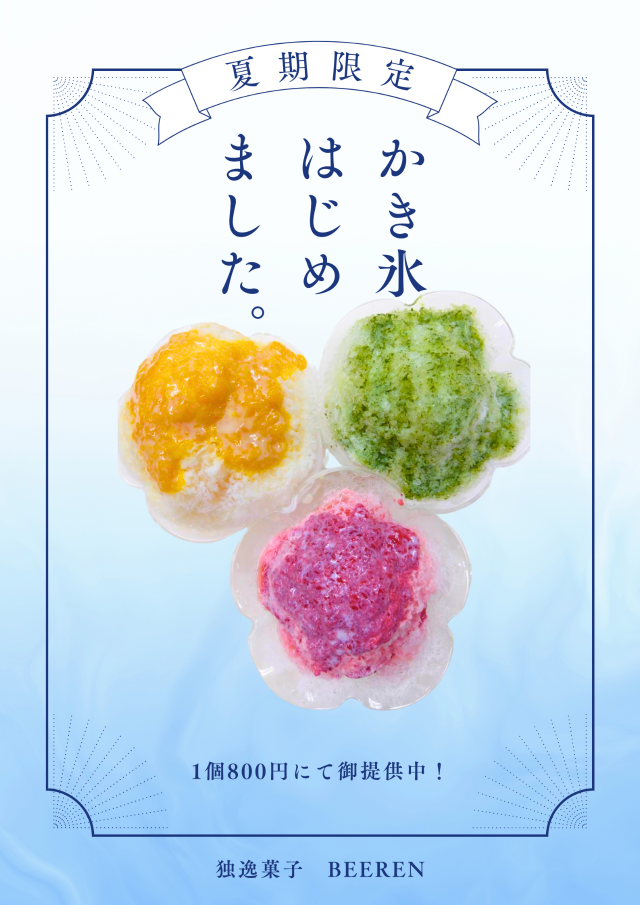 季節のケーキ 投稿日2024.08.14 ◇新発売!かき氷はじめました◇ この記事は、投稿から半年以上が経過しています。 料金やサービス内容など、現在のサービス内容と異なる場合がございます。 かき氷の販売が始まりました!!! お味は3種類♪ 〇いちごミルク 〇マンゴーミルク 〇抹茶ミルク 自家製の果肉入りソースと練乳をかけたべーレン特製かき氷です(*^^*) 中には、生クリームやカスタードクリームなどケーキ屋ならではのお味が楽しめます(^^♪ 8月20日(火)までお試し価格『600円』で販売中です! 暑い日のおやつにぜひ! テラス席でお召し上がりください(*^^*)